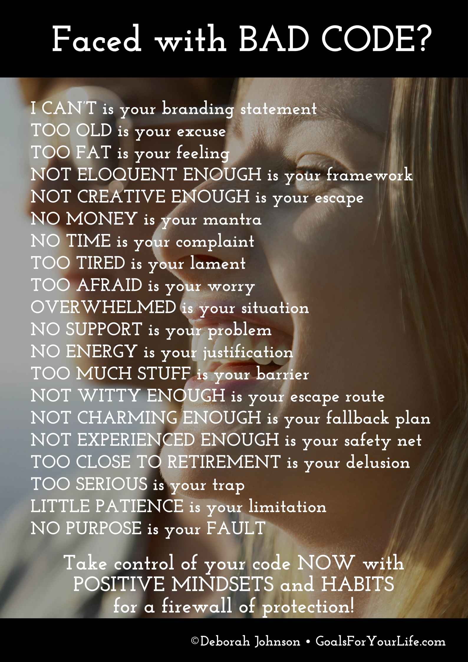Journaling may or may not work for you, but find something that will. Take control of your bad mental code NOW with POSITIVE MINDSETS and HABITS for a firewall of protection! I wrote a whole book and a recent online course about this as I have seen and worked with so many who are frozen in fear and uncertainty. Whatever you decide to do, take action. Don’t let this year go by with the bad code and virus of self-doubt and confusion! Remember —You are worth so much more than that!